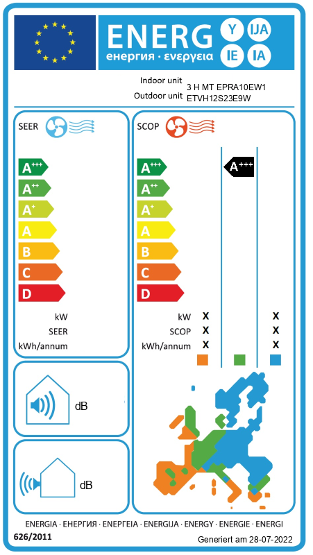 Daikin Altherma 3 H MT EPRA10EW1 Monoblock Wärmepumpe 10 kW Außengerät | WiFi | R32 | 400 Volt | | Abmessungen | mm | H x B x T | 1.003 x 1.270 x 533 | | Absicherung | 16 A | | Abtauverfahren | Prozessumkehr | | Ausführung Außengerät | Kompakt Wärmepumpe | | BAFA SG Ready | JA | | BAFA-Förderung | JA | | COP Heizen A-7/W35 | 3,14 | | COP Heizen A2/W35 | 4,23 | | COP Heizen A7/W35 | 5,10 | | EER Kühlen A35/W18 | 4,26 | | EER Kühlen A35/W7 | 3,10 | | Einsatzbereich Heizen | -28 bis +25 (°C) | | Einsatzbereich Kühlen | +10 bis +43 (°C) | | Einsatzbereich Warmwasserbereitung | -28 bis +35 | °C | | Energieeffizienz Heizen | | | Energieeffizienz Kühlen | | | Energielabel erstellen | 0 | | Fernbedienung inklusive | Ja | | Fernbedienung Typ | Kabelfernbedienung | | Gerätetyp | Kühlen/Heizen/Warmwasser | | Gewicht kg | 118 | | Heizleistung (min.~max.) in KW | 10,0 | | Kältemittel GWP-Wert | R32: 675 | | Kältemittel Höhendifferenz Außengerät-Innengerät max. in Meter | 10 | | Kältemittel Typ | R32 | | Kältemittelmenge (vorgefüllt) in Kg | 3,25 | | Kühl-/Heizleistung AG | von 7,5 bis 9,9 kW | | Kühlleistung (min.~max.) in KW | 10,0 | | Leistunsgregelung Methode | Inverter geregelt | | Nennheizleistung A-7/W35 | kW | 8,84 | | Nennheizleistung A2/W35 | kW | 8,05 | | Nennheizleistung A7/W35 | kW | 9,25 | | Nennkühlleistung A35/W18 | kW | 11,77 | | Nennkühlleistung A35/W7 | kW | 7,97 | | Schalldruckpegel Aussengerät Kühlen/Heizen dB(A) | 47 | 41 | | Schalldruckpegel min. | 41 | | Schallleistungspegel Aussengerät Kühlen/Heizen dB(A) | 61 | 55 | | Schallleistungspegel Heizen max. dB(A) | 53 | | Schallleistungspegel Heizen nom. dB(A) | 52 | | show_stock | 1 | | Spannungsbereich max. | -10% | | Spannungsbereich min. | 10% | | Spannungsversorgung Aussengerät | 380-415 V / 3 Ph / 50 Hz, N, PE | | Ventilator Luftstromvolumen Heizen Nom. m³/min | 80,1 | | Ventilator Luftstromvolumen Kühlen Nom. m³/min | 80,1 | | Verdichter Typ | Scroll-Verdichter | | Wärmepumpen | System | Monoblock-System | | Wärmepumpen | Typ | Luft/Wasser | | Wasserkreislauf Rohrleitungsanschlüsse | Zoll | 1" | | WiFi/WLAN Funktion | Ja | |